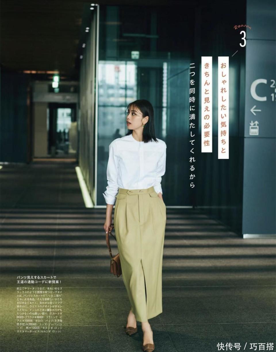 如果你未来想要在金融行业、法律行业以及咨询类行业有所建树,在挑选面试穿搭时一定要选择相对严谨、正式的单品,纯白衬衫搭配高腰H型西装裙效果最佳,裙身过膝正式又能展示女性魅力。